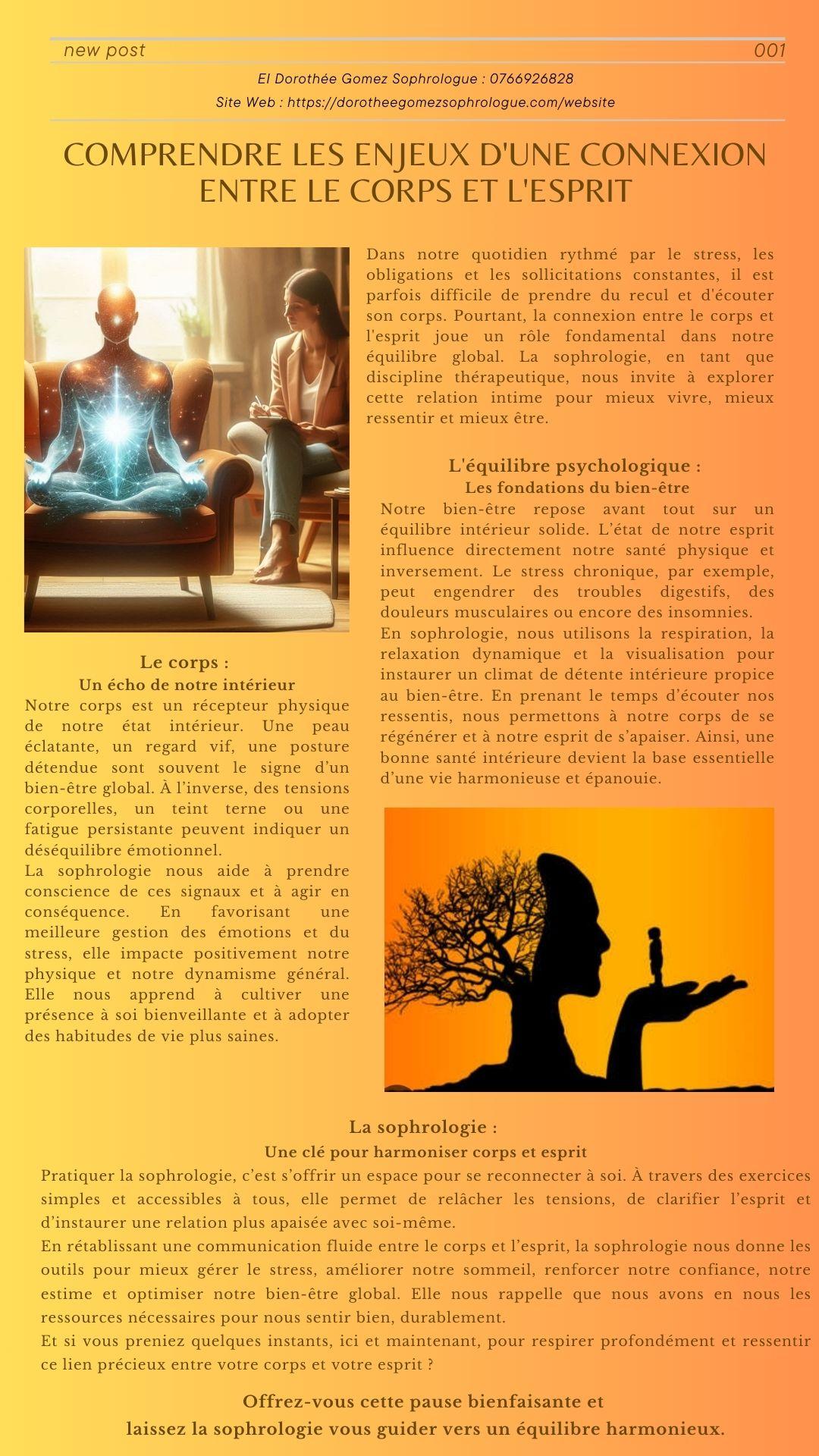 Dans notre quotidien rythmé par le stress, les obligations et les sollicitations constantes, il est parfois difficile de prendre du recul et d'écouter son corps. Pourtant, la connexion entre le corps et l'esprit joue un rôle fondamental dans notre équilibre global. La sophrologie, en tant que discipline thérapeutique, nous invite à explorer cette relation intime pour mieux vivre, mieux ressentir et mieux être.